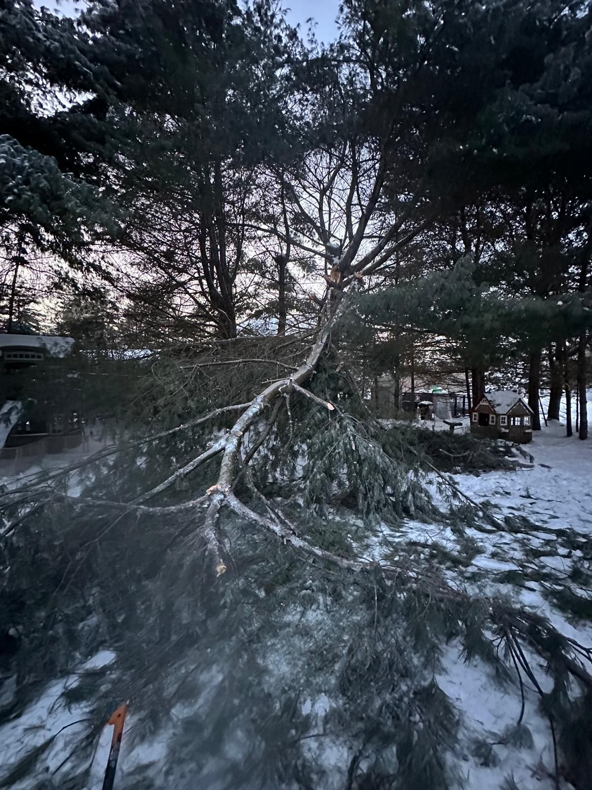 We had a recent ice storm and there was lots of damage everywhere in the community. It happens, we just have to deal with it. The night of the start we heard a loud CRACK ! Followed by a BOOM !! I ran around the house to see if any windows or doors had opened. I shone the flashlight outside to see if any trees had snapped. Lo and behold a giant branch 25 feet or greater had snapped and was now hanging on top of 2 or 3 healthy still attached branches. There were other pine trees that had broken branches entangled within the tree network.