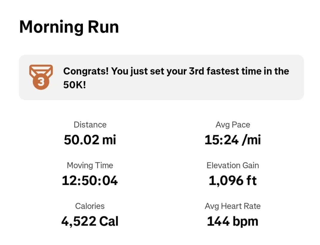 Yesterday did a 50 mile run. May not have been the distance I wanted but it is the distance my body gave me and the contemplations to go along with them.