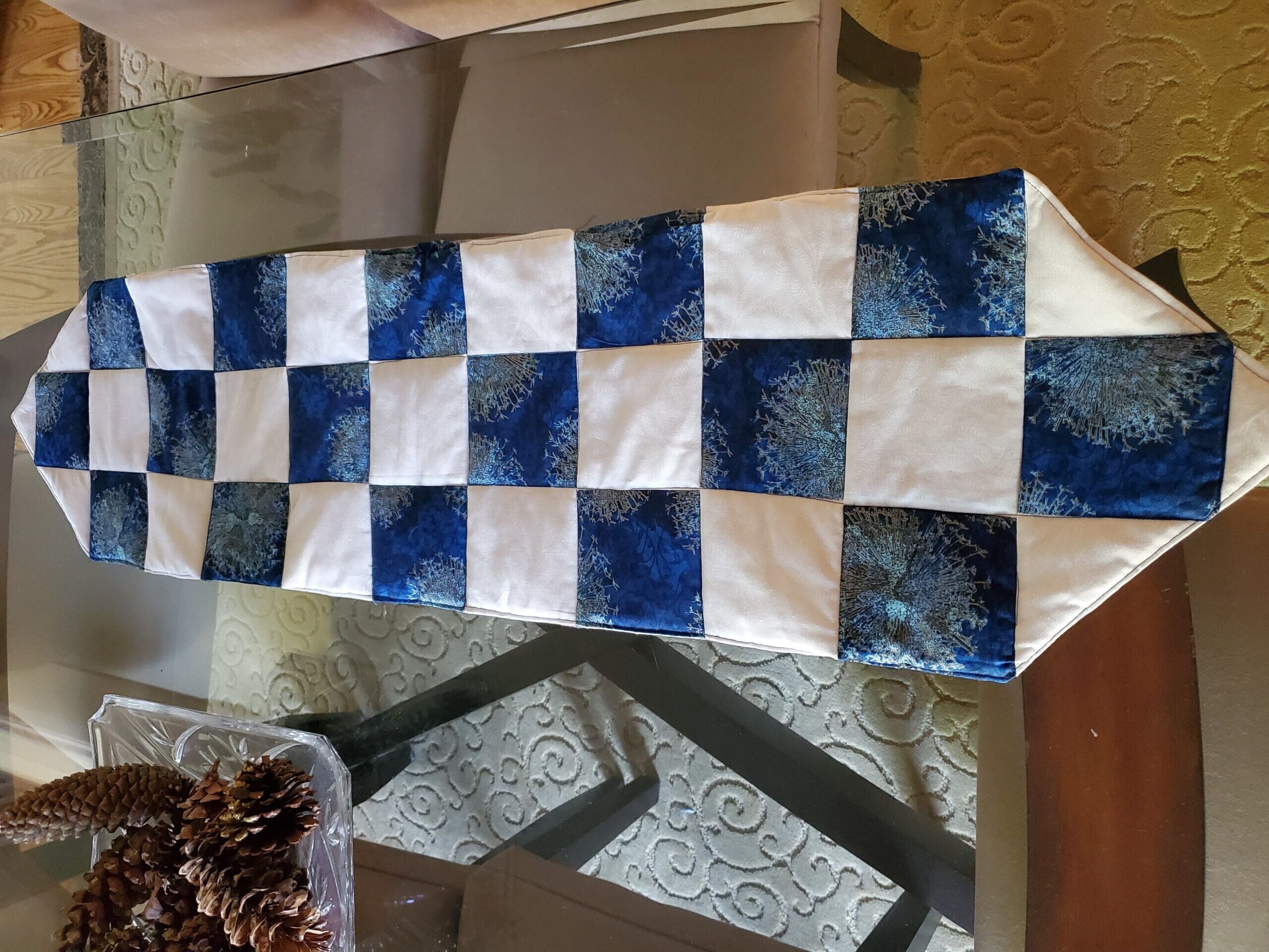 I turned around and she proceeded to get up. She pulled out a back hidden under chair and as if by magic pulled out 3 beautiful table runners that she had quilted. Each one more unique than the next.